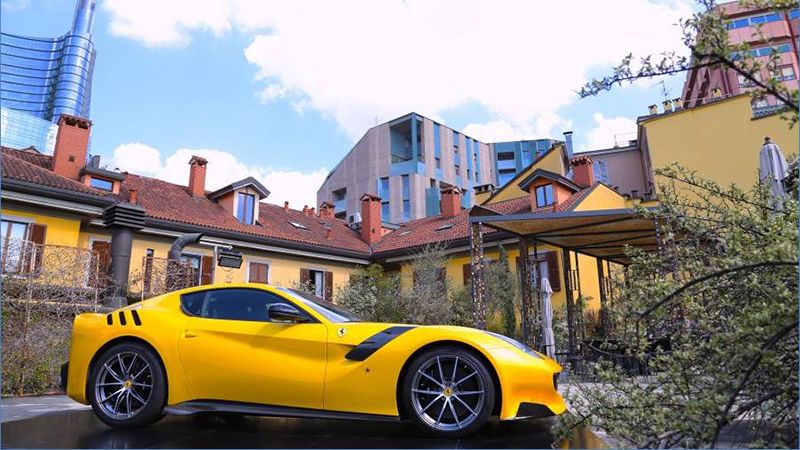 Todo un espectáculo para la vista: un Ferrari F12tdf amarillo metalizado reluciendo al sol en la azotea de la prestigiosa Galería milanesa Sozzani en Corso Como n.º10...